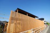 大きな川の北側に堤防道路の下に面して建つお宅を建て替えることになりました。 その堤防道路から覗き込まれることをどのように避けるかが第一の課題でした。視線は避けても採光は必要、お客さんと考えた末に連格子で半可視な壁を造ることとし、それを全体デザインに取り入れる。 その結果とても印象的な外観を持つお宅が出来上がりました。