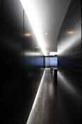 室内は窓からの風景が引立つようモノトーンで統一しながらも、壁の染色された天然木の突板、床の金属的な質感を持つ大判タイル、そして漆塗りのテーブルトップなどの特徴的なテクスチャーを持つ素材を用いています。間接光を主体とした照明を用いる事で窓へ向かう奥行き感を演出するとともに、それぞれのテクスチャーを浮かび上がらせるように工夫しています。
