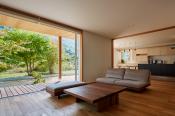 深い軒を計画し、その軒下空間である中間領域が心地よく、夏には日射を遮り、通風のみを感じられる住まい。エアコン等の空調設備を出来るだけ使用しなくても心地よさの感じられるパッシブデザインを目指した。