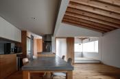 木製の塀は、庭を隣地や道路からの緩衝帯とし、空や樹木などの風景を室内の延長として取り込んでいます。