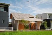 不動産価値的にはマイナス要素が多いとされる旗竿敷地だが、竿部分を豊かなアプローチとして有効に利用してやると、一転プライバシーの確保された落ち着いた住まいを獲得しやすい魅力ある敷地となる。