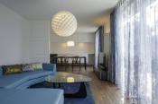 デザインするにあたっては〈光と色〉も意識しています。例えばリビング・ダイニングでは、 〈藍色〉のレースカーテン越しに広がる外光の色を、空間の基調としました。夫婦の寝室では、〈浅紫色〉のアクセント壁が反射する沈んだ色の光を、空間の基調としました。