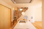 郊外の旗竿敷地に建つ2階建ての住宅です。子どもたちが自由に庭遊びができるようにリビングダイニングと庭がつながり、大きなアイランドキッチンからは、すべてを見渡せるようになっています。階段の下には、子どもの隠れ家スペースがあり、その上には階段書棚があります。共働きでも子育てしやすいように、効率的な家事動線としています。子供たちがのびのび成長できる家になっています。