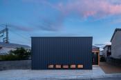 機能的な生活動線と収納量の確保のために就寝・食事・仕事・遊びといった日々の生活の場を集約した大きな筐(はこ)をつくり、カーテンで柔らかく性格付けしました。それに連なるように、水廻りとクローゼットを納めたサーバントスペース、来客や将来ご両親との同居を想定したゲストルームを組み合わせ、大・中・小3つの筐体が重なり合う建物となりました。それを敷地のほぼ中央に置き、周辺の雑多な環境と間合いを取りました。延べ20坪で1.5階分の平屋、高気密高断熱で窓の少ない外観、隣地から大きくセットバックした配置はこれからの郊外での住み方を示しているようにも思われます。