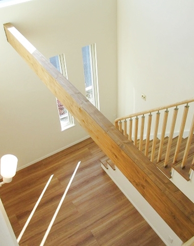 南側は道路に面するので外からの視線を遮りながらも開放的なリビングにする為、スキップフロアを採用しました。 このスキップフロアが階段ホール吹抜の空間を豊かにしています。